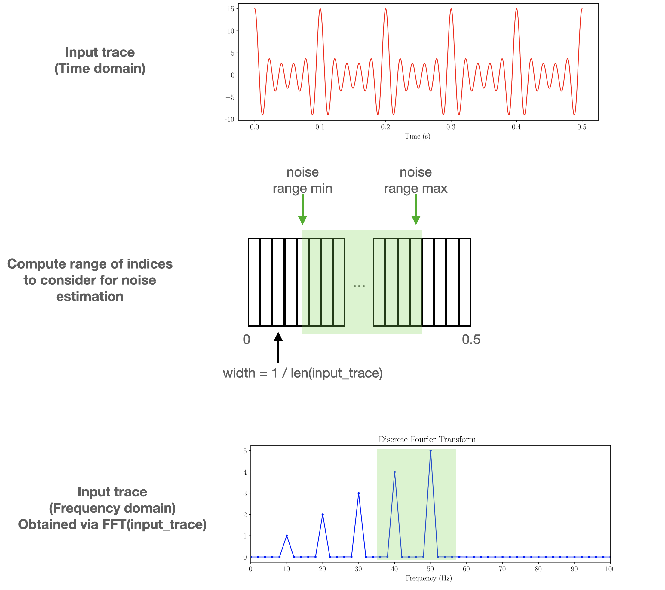 get_noise_fft computes noise by calculating the power spectral density of the trace using a FFT, over a desired noise range (hardcoded, not configurable by the user). This PSD is then averaged using mean. Here’s a diagram to demonstrates how noise is computed this way: