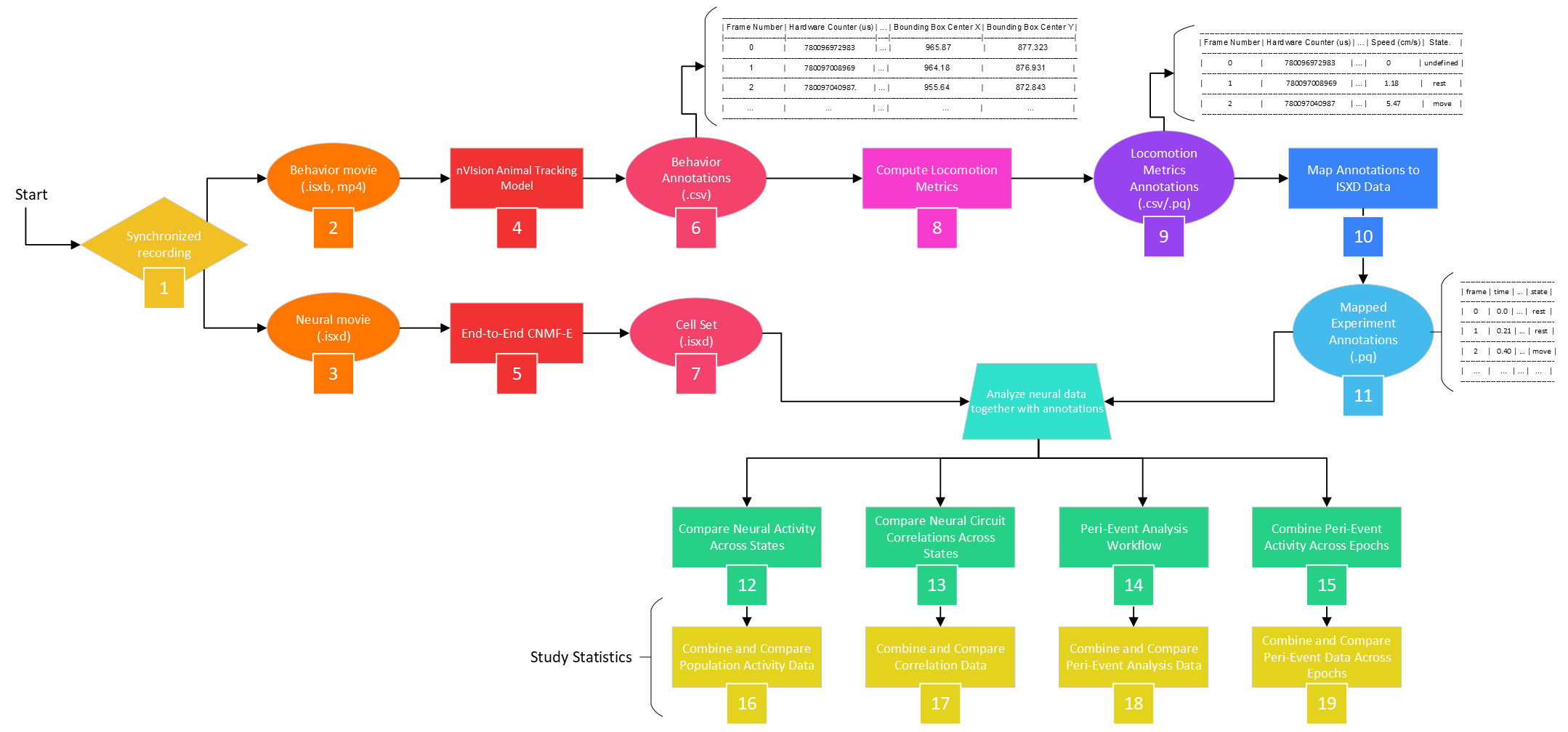 If you enabled live tracking on your nVision, then the .isxb behavioral file contains the tracking info as metadata, which can be extracted using the Extract Tracking Data from nVision Movie analysis table. However, the provided mp4 files were not tracked live, so the nVision Animal Tracking Model can calculate these metrics post hoc. This corresponds to [4] Generate/Extract tracking Data from Behavior Movie and the resulting [5] Behavior Annotations (.csv) in the IDEAS flowchart.