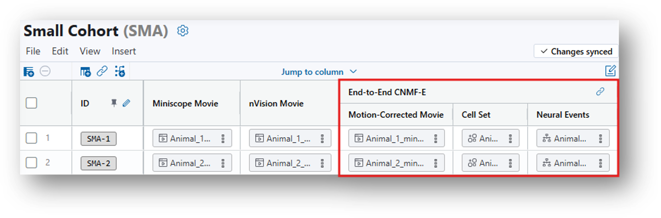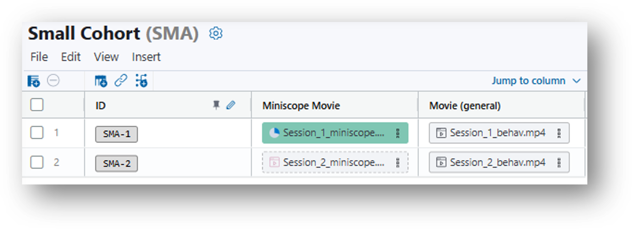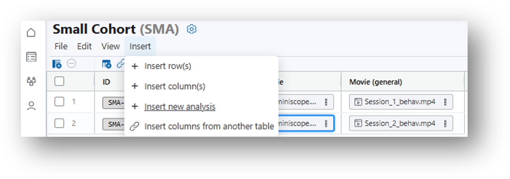 - Insert>Insert column(s)>Column Type 'File'>Data Type 'Miniscope Movie'>Insert
