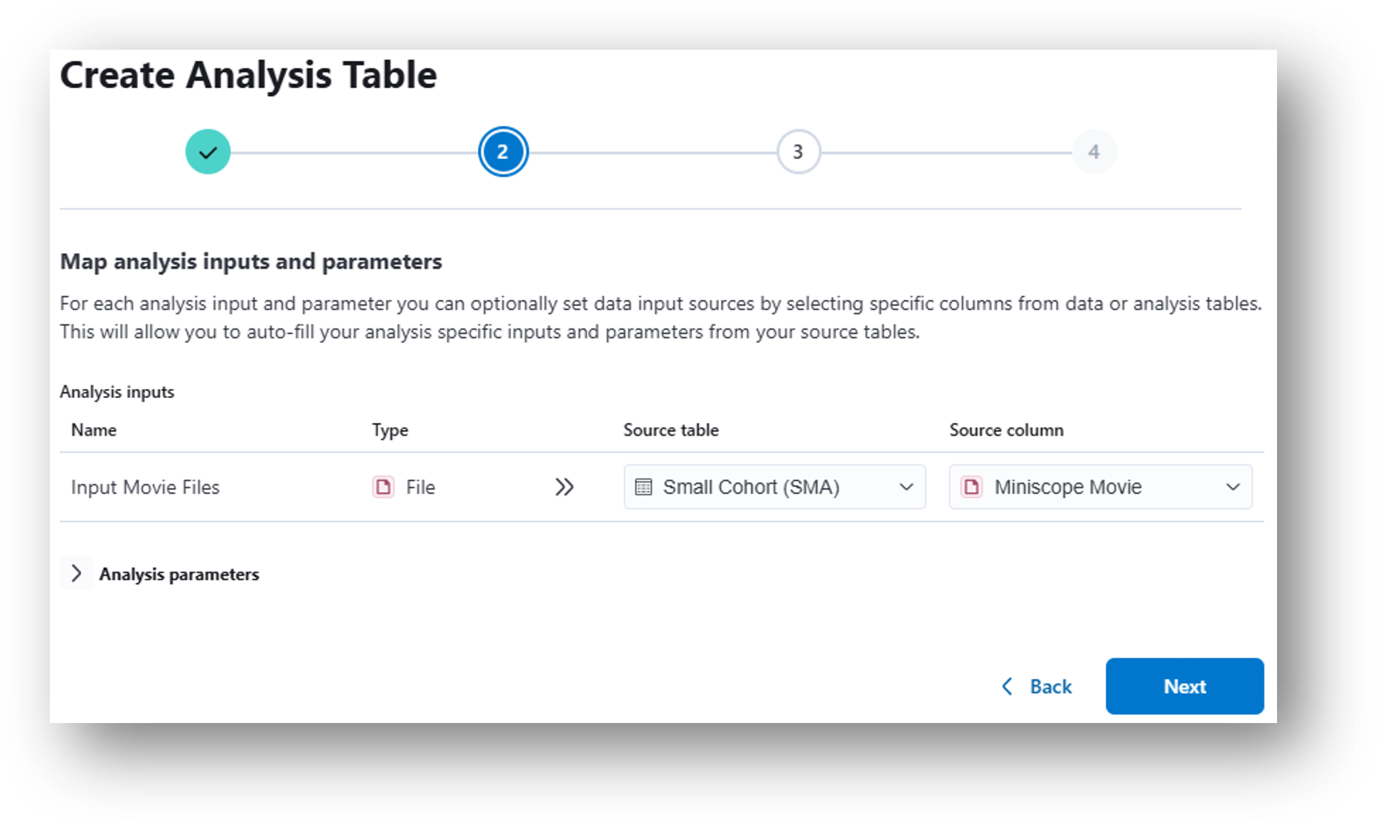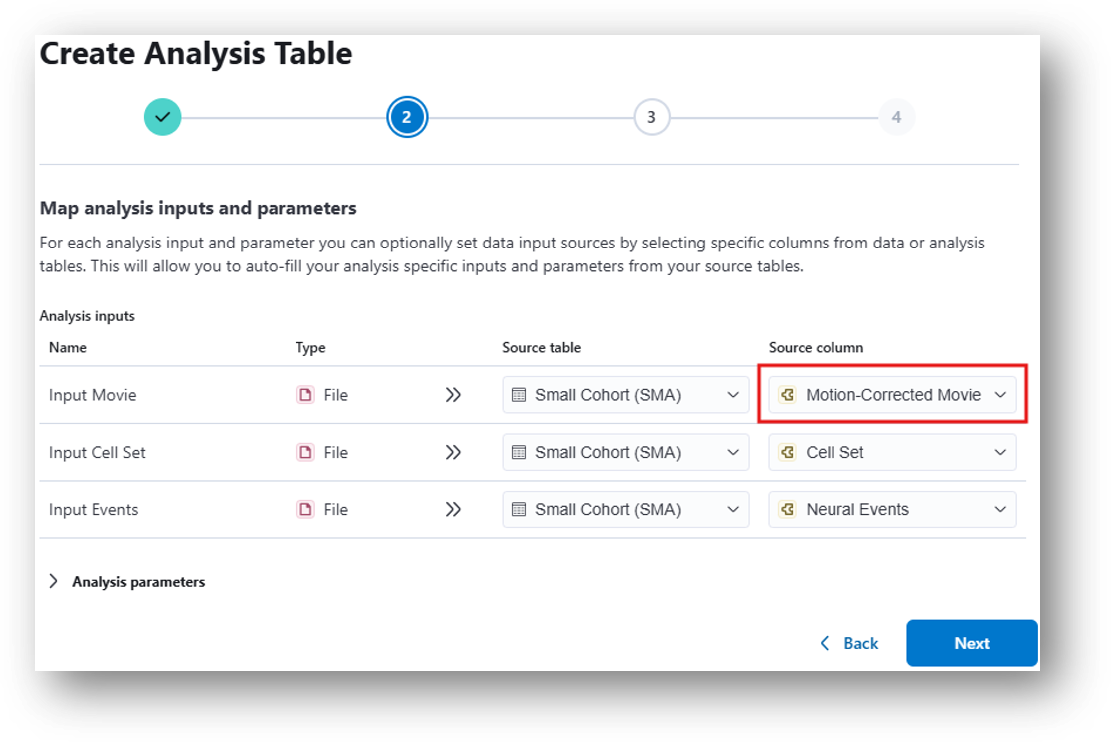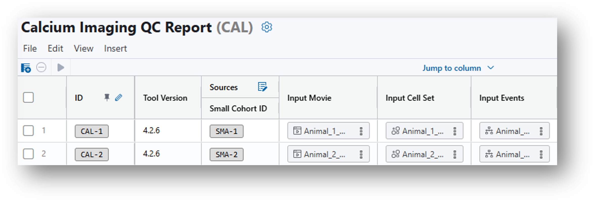 12. Having navigated back to the Small Cohort Data Table, create and run a Calcium Imaging QC Report analysis table following the same steps as you went through to create the End-to End CNMF-e analysis, but this time selecting Calcium Imaging QC Report from the analysis dropdown menu.