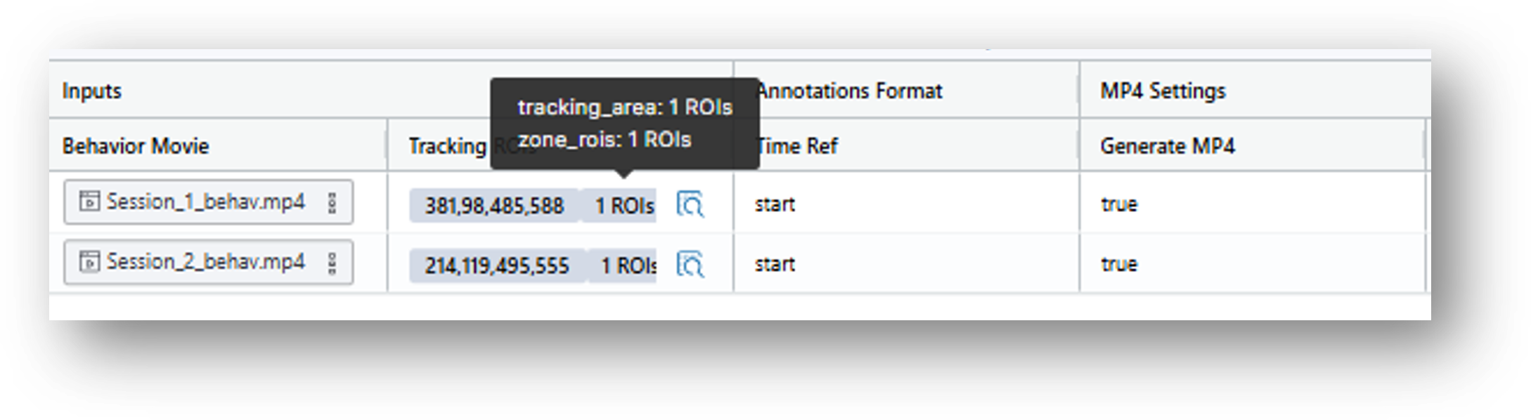 21. When you have finished, look at the nVision Animal Tracking Model Analysis table and hover over the cells in the Tracking ROI’s column to confirm that you see both the tracking_area and zone_ROIs you have defined. Then click
