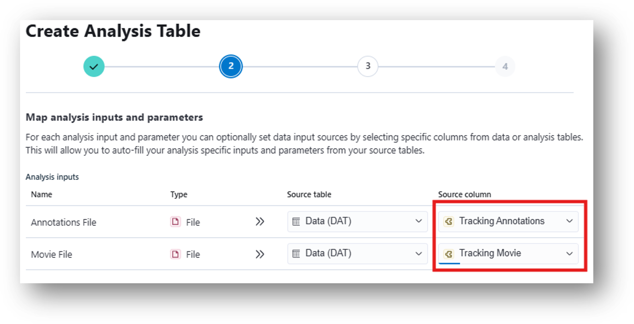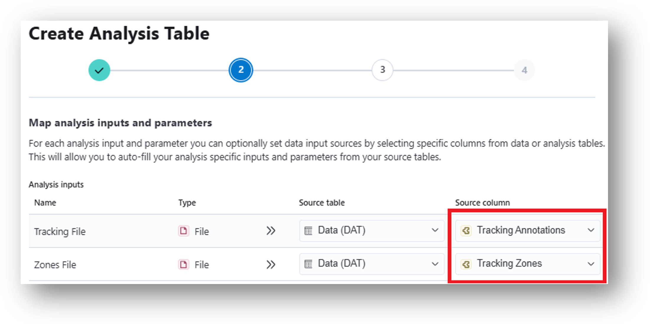 22. Input these results into the Zone Occupancy Analysis which will calculate metrics related to movement through user-defined zones (e.g., times of zone entrance/exit and epochs of zone occupancy). When mapping analysis inputs from your data table, select Tracking Annotations as your Source column for the Tracking File and Tracking Zones as your Source column for the Zones File.
