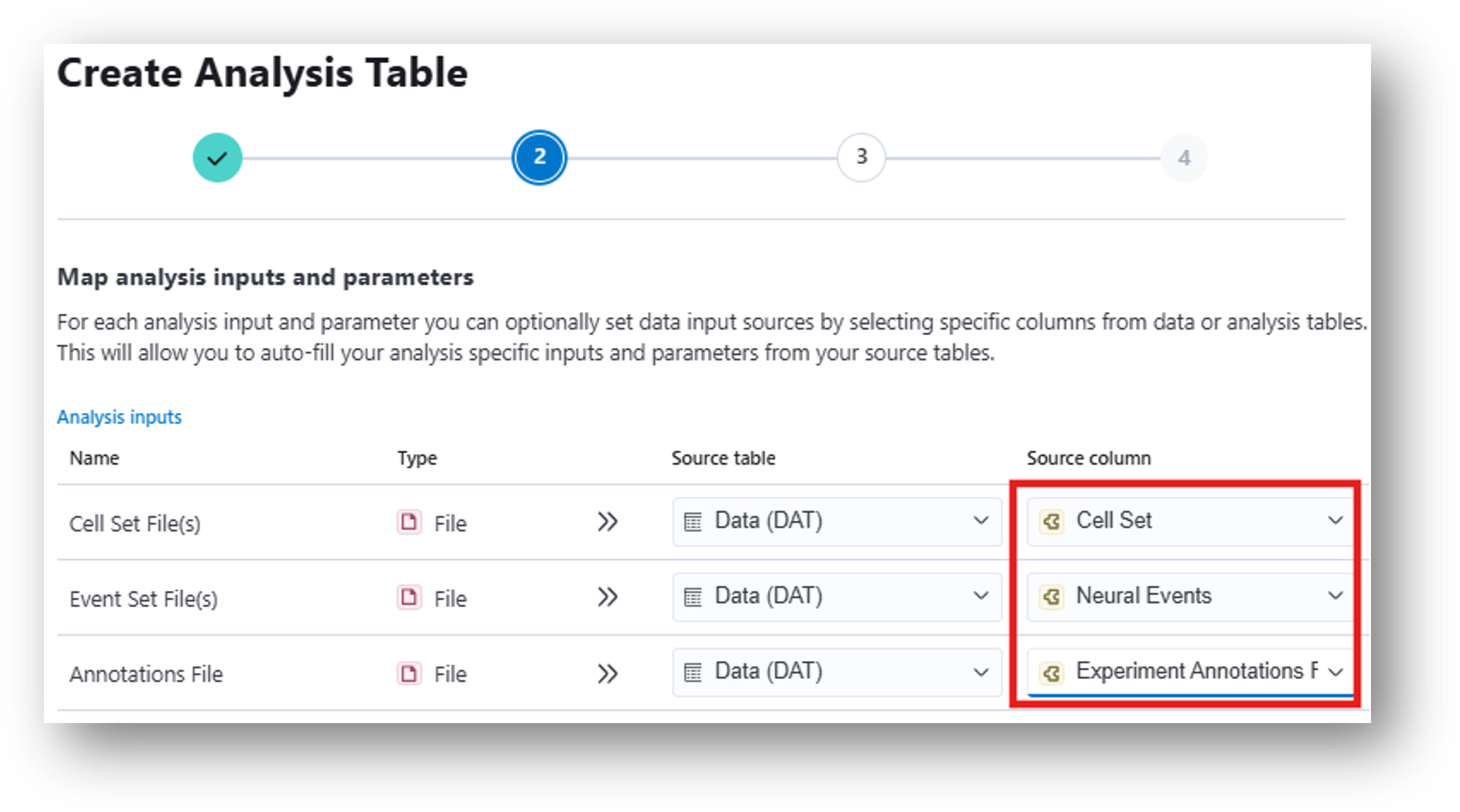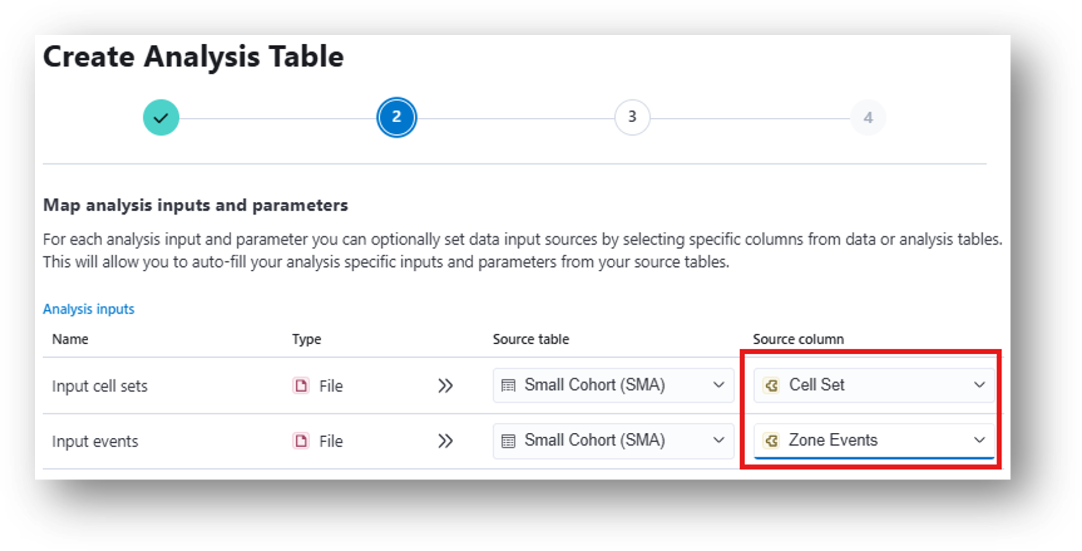 - The results from the Zone Occupancy Analysis can be used to run the Peri-event analysis, which compares neural activity pre/post annotated events. To map the correct inputs from your data table, select Cell Set for the Input cell sets row and Zone Events for the Input events row.