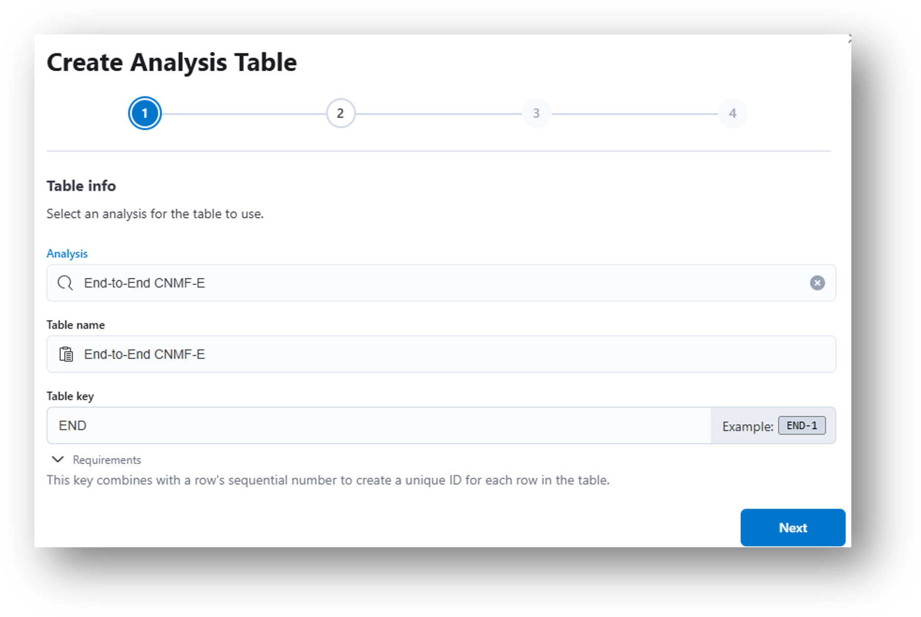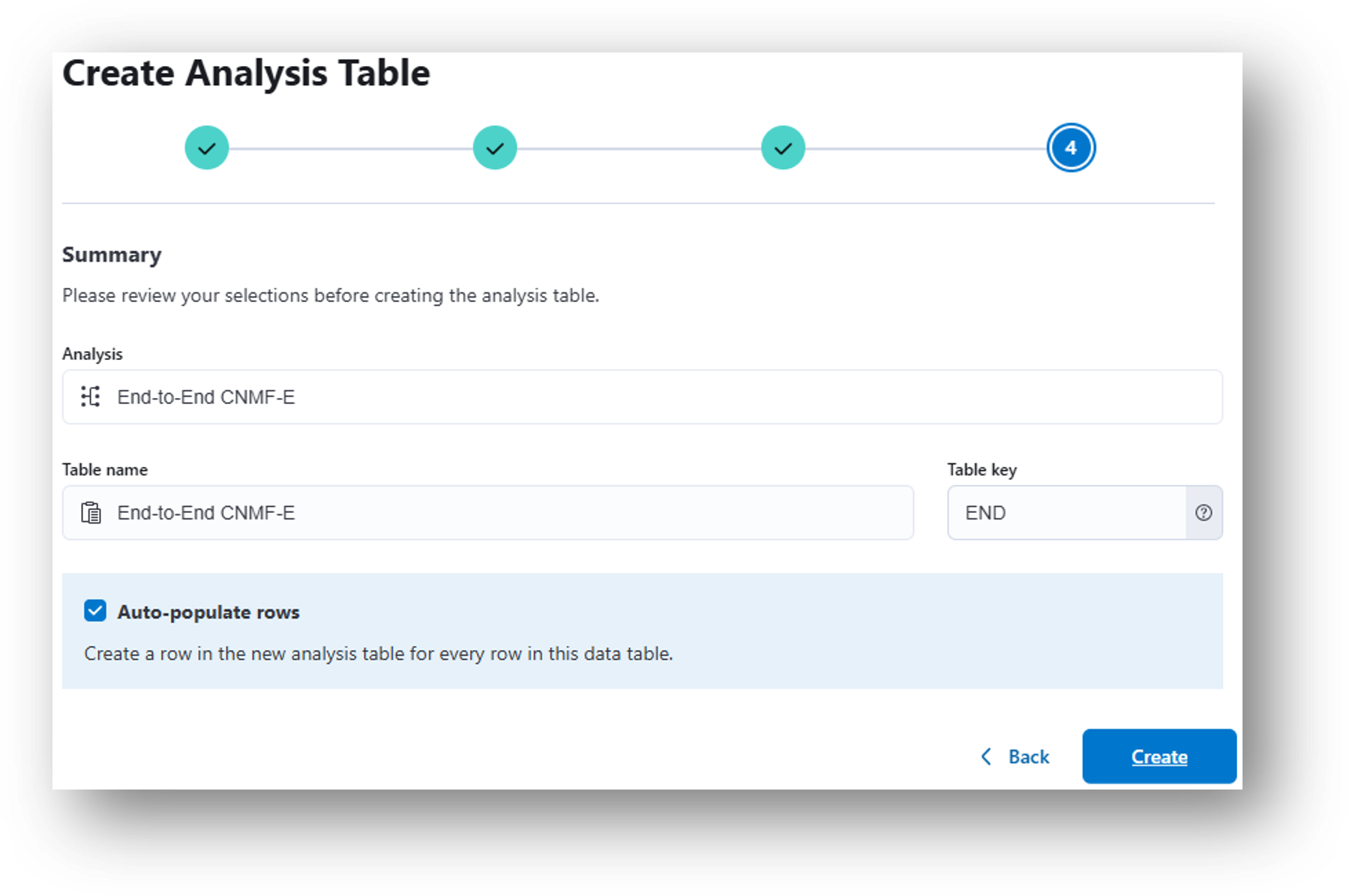 - (Step 4) Review the details and click Create to generate the analysis table.