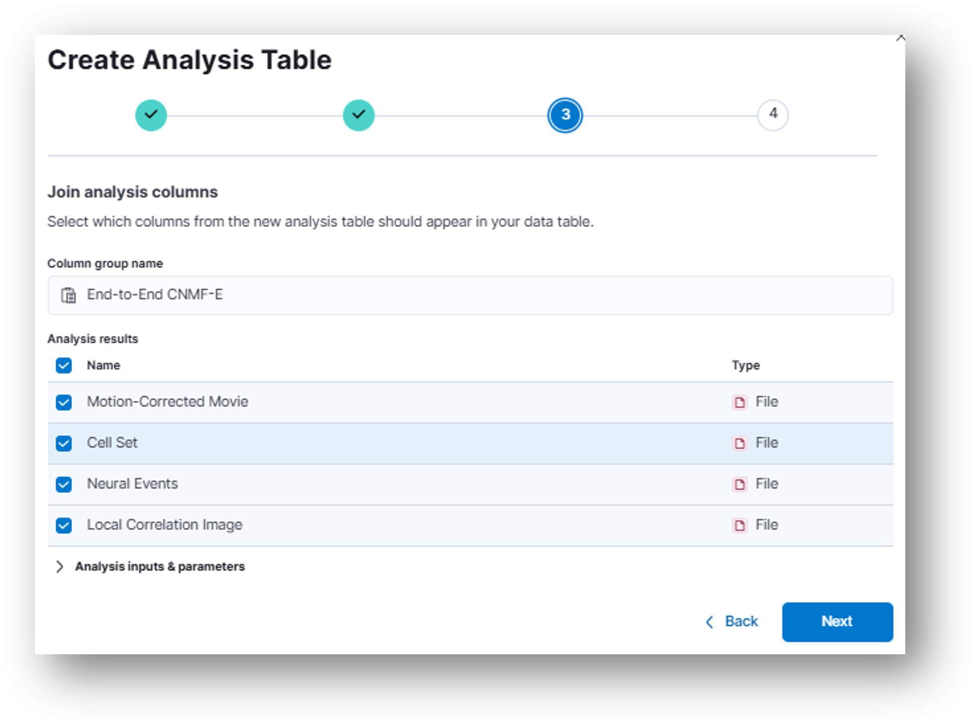 - (Step 1) Under the Analysis dropdown menu, select End-to-End CNMF-E. Click Next.