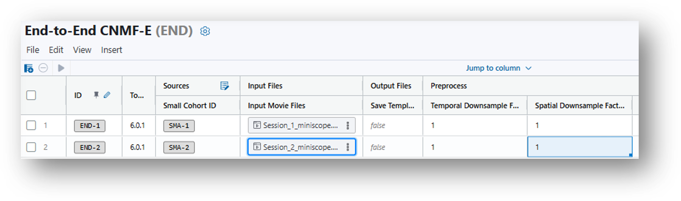 8. Having created the End-to-End CNMF-E analysis table, there will be a row for every recording in the original data table. The parameters, listed in columns to the right of the Input Files, will be populated by default suggestions and can be adjusted according to your needs. Please refer to the End-to-End CNMFe documentation and/or this iQ page for info on each parameter. In the case of the demo files, it is recommended that you set the Temporal Downsample Factor and Spatial Downsample Factor to 1, as the files have already been sized for faster file transfer speed.