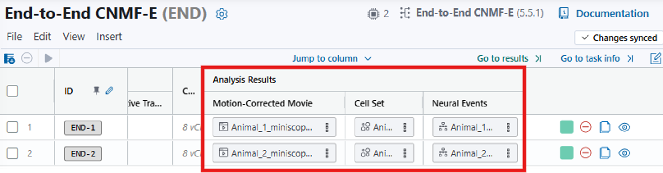 11. Scroll to the right and you can access the End-to-End CNMF-E results: