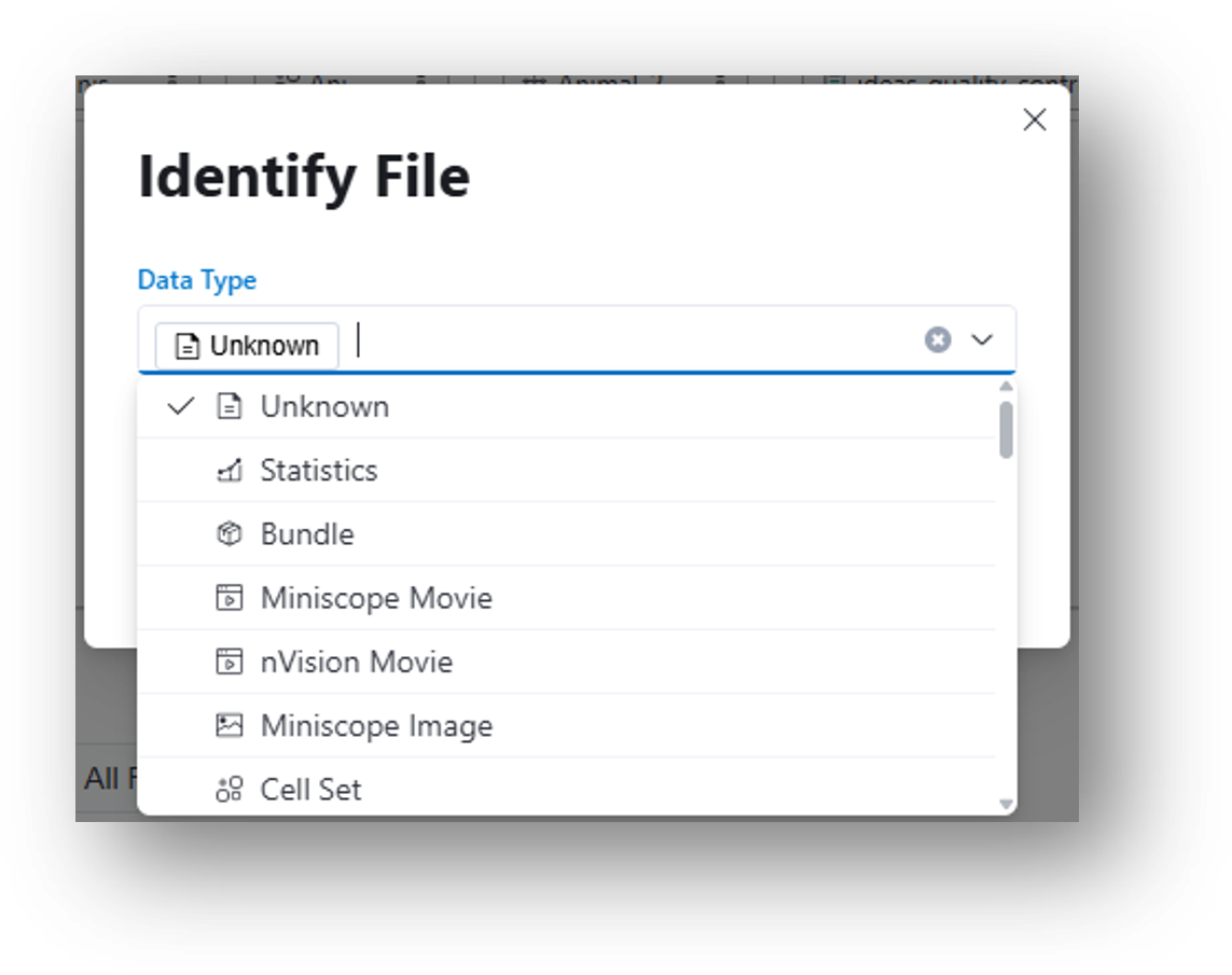 IDEAS accepts any file format (e.g., .isxd, .gpio, .imu, .csv, .mp4). For example, you can upload videos from your external behavior camera as well as manual scoring or annotation files generated outside of IDEAS. These scoring/annotation files would correspond to [6] Behavior Annotations in the IDEAS flowchart. Note: IDEAS may not automatically identify the file type or generate previews for certain uploads. For instance, a file with a .csv extension could be one of several file types and is therefore labeled 'Unknown' by default.